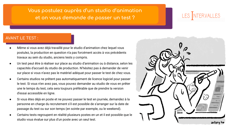 Quelques rappels et conseils donc, tant sur vos droits que sur la réalisation d’un test, que ce soit en layout, anim, storyboard etc.