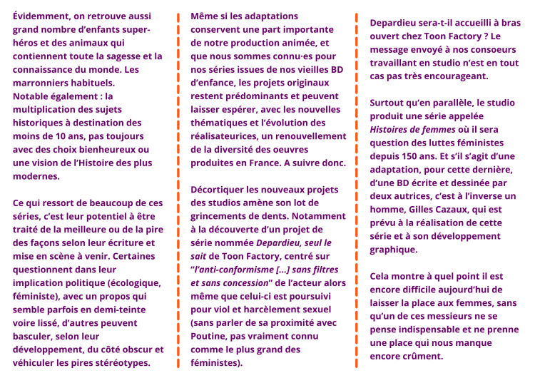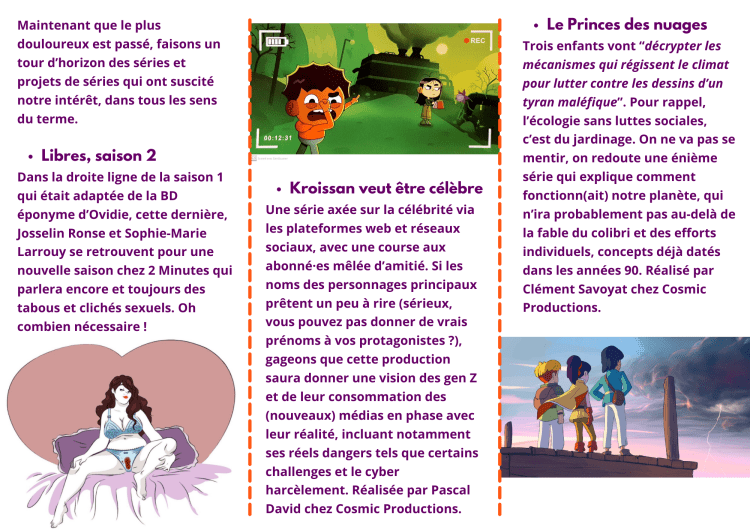 Rien que pour vos beaux yeux, on a décortiqué toutes les séries annoncées dans l’Ecran Total de décembre 2021, afin de vous proposer un état des lieux de la parité en développement et production, ainsi qu’un petit panel des projets qui ressortent le plus par rapport à l’ensemble des séries produites (formats, sujets, cibles).