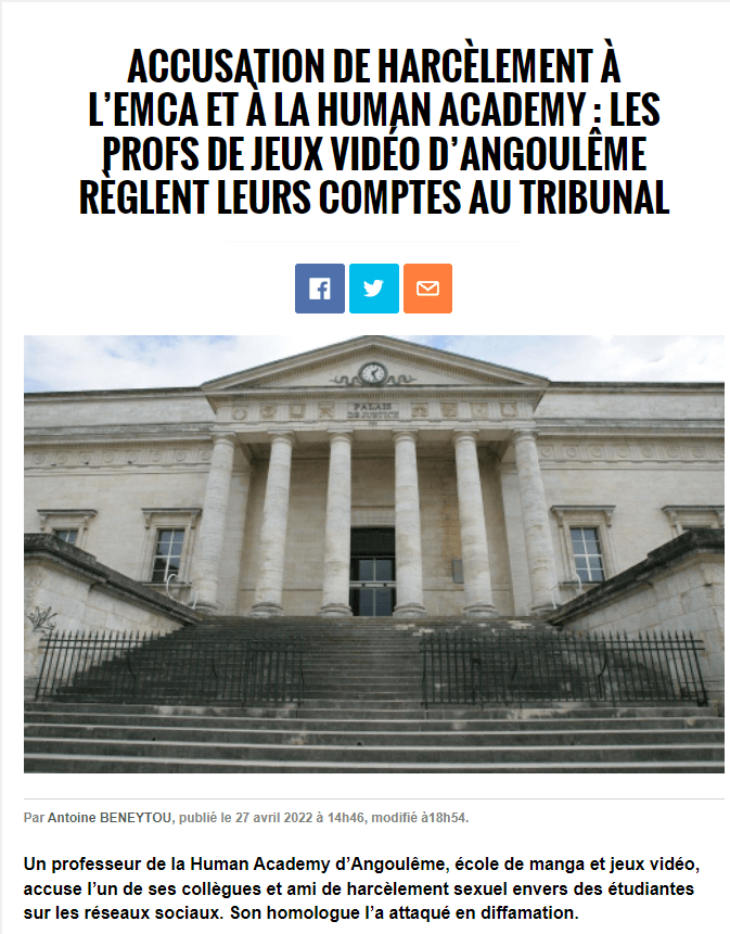 Accusation de harcèlement à l’EMCA et à la Human Academy : les profs de jeux vidéo d’Angoulême règlent leurs comptes au tribunal. Derrière ce titre de Charente Libre terriblement aguicheur (lisible en bas de page) se cache surtout une attaque en diffamation d’un professeur accusé par ses élèves de harcèlement. Les étudiant·es s’étaient en amont plaint·es auprès de l’école du comportement inapproprié du professeur, sans que celle-ci ne réagisse à moins qu’une plainte ne soit déposée.