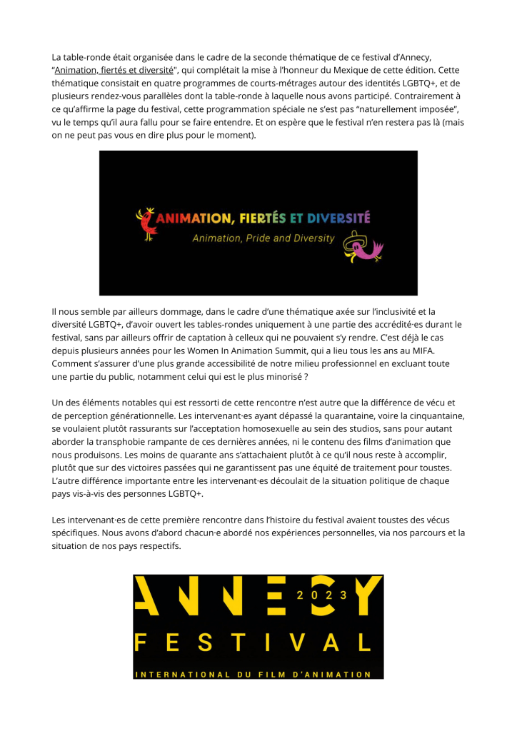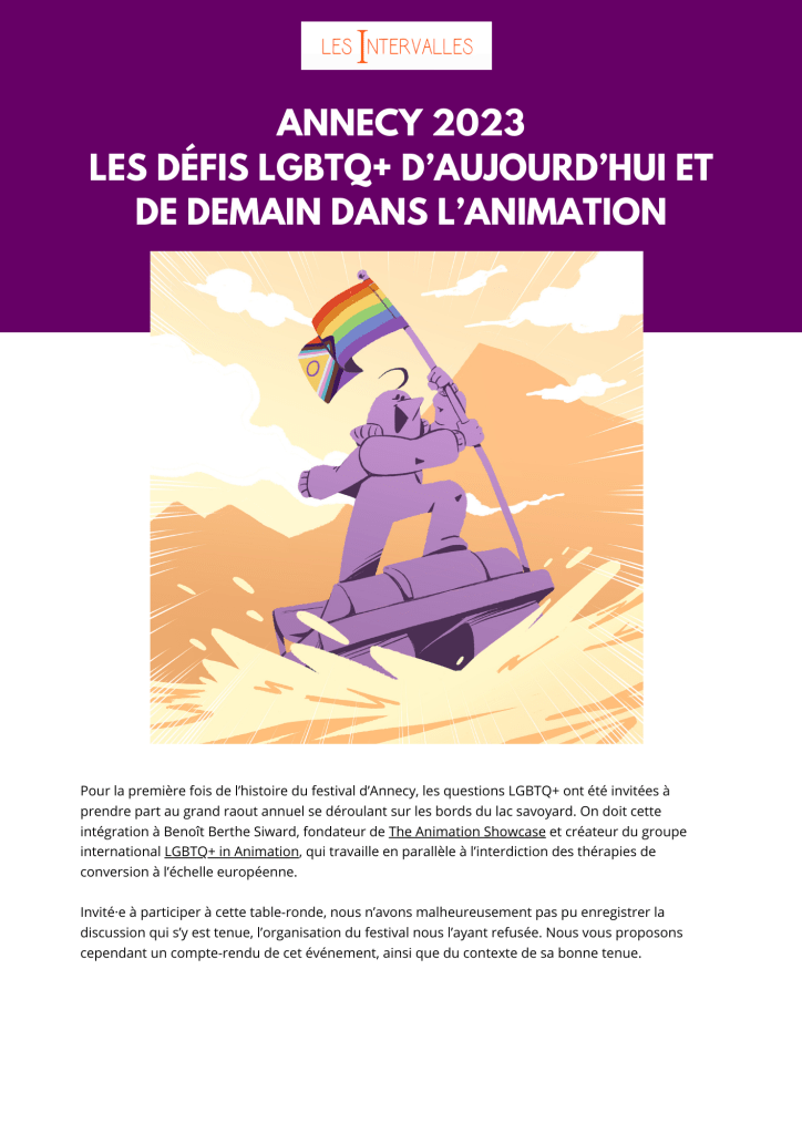 Pour la première fois de l’histoire du festival d’Annecy, les questions LGBTQ+ ont été invitées à prendre part au grand raout annuel se déroulant sur les bords du lac savoyard. On doit cette intégration à Benoît Berthe Siward, fondateur de The Animation Showcase et créateur du groupe international LGBTQ+ in Animation, qui travaille en parallèle à l’interdiction des thérapies de conversion à l’échelle européenne.