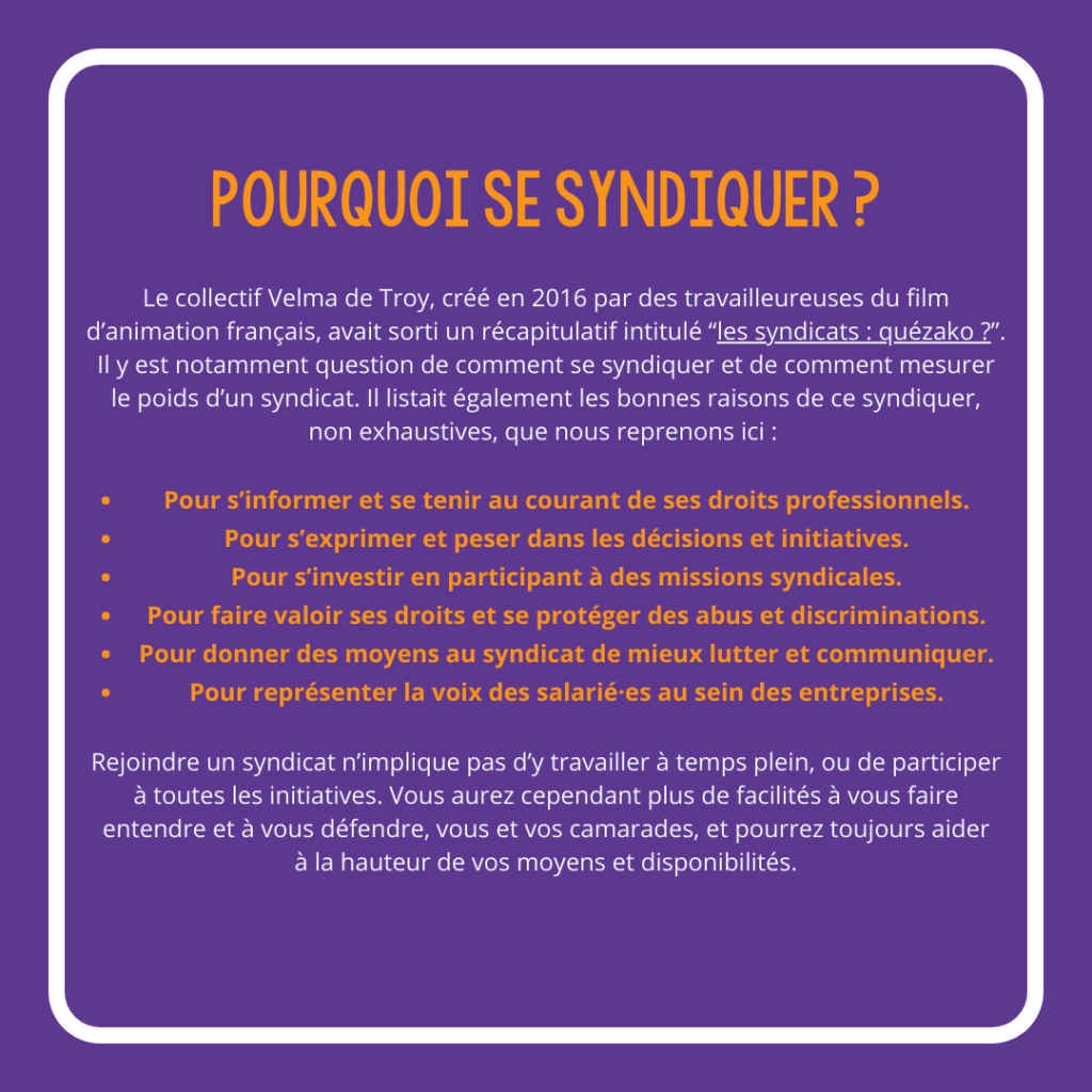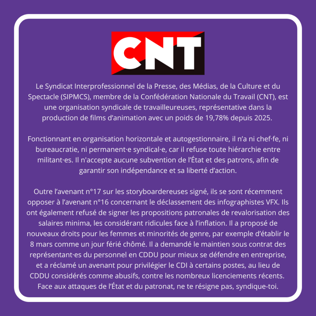 Représentatif ou non, un syndicat avec une branche dédié au film d’animation est avant tout là pour défendre, représenter et conseiller les travailleureuses. Savoir vers qui se tourner est alors primordial.