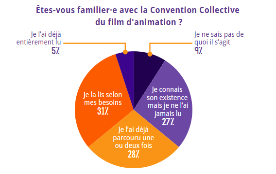 Chose étonnante, 6% des répondant·es déclare exercer leur travail à un poste autre que ceux listés dans la Convention Collective. Il est possible que certains postes, tels la simulation de foule, le fur ou le fix anim, qui n’apparaissent pas dans la Convention Collective, expliquent ce pourcentage. Sachant que 41% des personnes qui ont listé un poste autre n’ont jamais lu la Convention Collective, une méconnaissance de celle-ci pourrait également partiellement expliquer les réponses autres aux postes listés.
