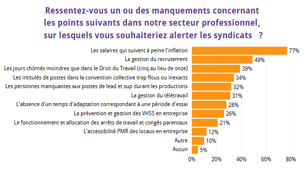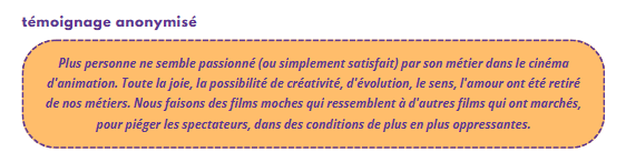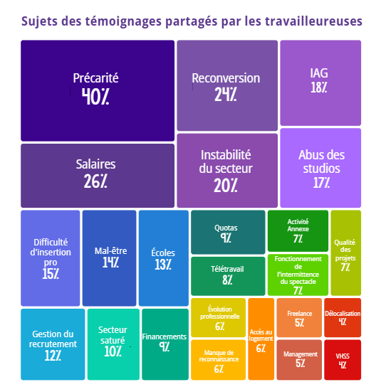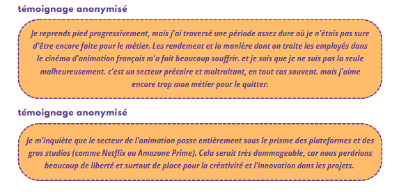 Les abus, manquements et inquiétudes tendent à se superposer les uns aux autres, et à accentuer un mal-être général ressenti par les travailleureuses. Beaucoup parlent non seulement des conditions de travail, des quotas trop importants, des deadlines impossibles à tenir, de la difficulté de faire ses heures (61% des répondant·es), du turn over en studio (39%), mais également de manque de reconnaissance et de la dépréciation de nos métiers, en partie induits par la dépendance au marché américain et par la délocalisation d’une partie de la chaîne de fabrication. On note également dans les témoignages des craintes récurrentes sur la montée des extrêmes droites en France et à l’étranger, sur l’impact que cela aura sur notre secteur professionnel et sur l’ensemble de la culture.