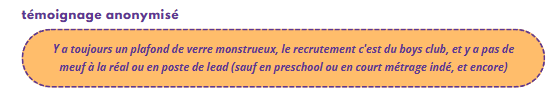 Le recrutement dépend d’un facteur chance non négligeable, qui fait qu’on doit rencontrer les bonnes personnes au bon moment, et mettre un pied dans la porte d’un studio pour qu’il nous rappelle ensuite d’une production à l’autre. Cela dépend de l’école que l’on a fréquenté, mais également des biais de chacun·e. Le plafond de verre, voire le mur de verre, n’est alors pas loin, car les femmes peinent encore à rejoindre les postes créatifs clés en dehors du court-métrage (voir nos études sur les représentations genrées sur la décennie 2010-2020, et sur les derniers Cartoon Forum, Cartoon Movie et Écran Total Spécial Animation).