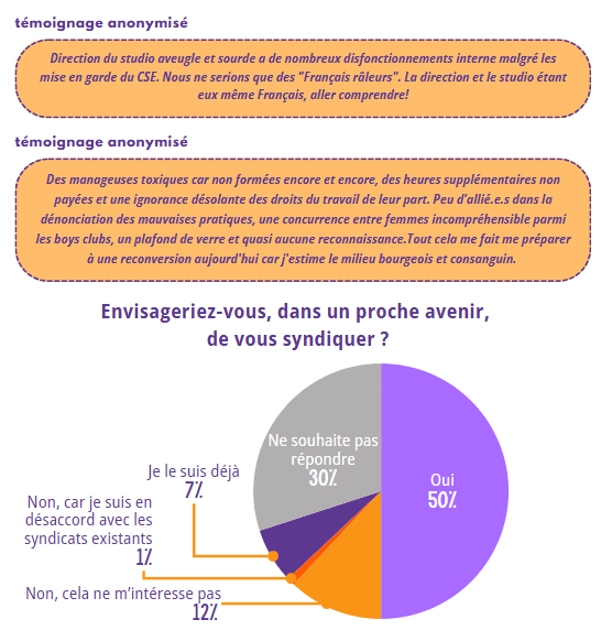 Beaucoup d’abus sont remontés dans les réponses au questionnaire, mais peu de témoignages font preuve de la conscience de l’illégalité de ces derniers, ou d’une conscience de la possibilité d’organisation collective pour les contrer. De même, nous notons une certaine difficulté dans les réponses à différencier un abus illégal d’éléments de production mal pensés, mais légaux, qu’il convient dès lors de mieux encadrer, d’améliorer. Peu de travailleureuses semblent avoir le réflexe de contacter les syndicats, qui sont là pour prodiguer conseils, et potentiellement soutien et protection. Il est aussi possible de se faire entendre en se regroupant au sein même des studios, qu’ils aient ou non des CSE. Certains témoignages font transparaître une crainte que la pression et la concurrence entre travailleureuses soit telle qu’il est impossible de lutter. Mais c’est justement en se faisant entendre collectivement que l’on pourra lutter, pas en s’écrasant individuellement devant les illégalités et les conditions de travail déplorables poussées par des budgets trop maigres et des quotas trop hauts.