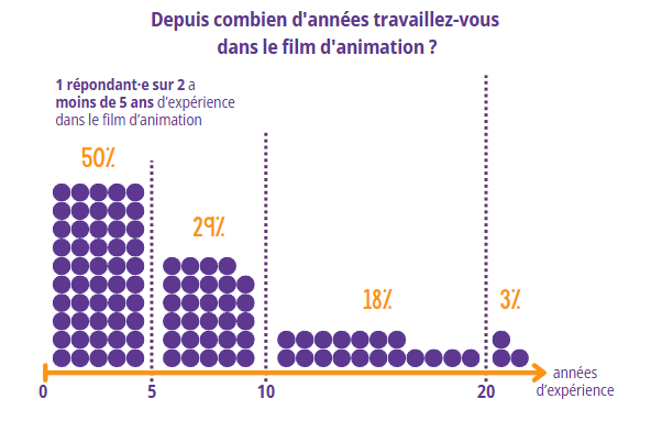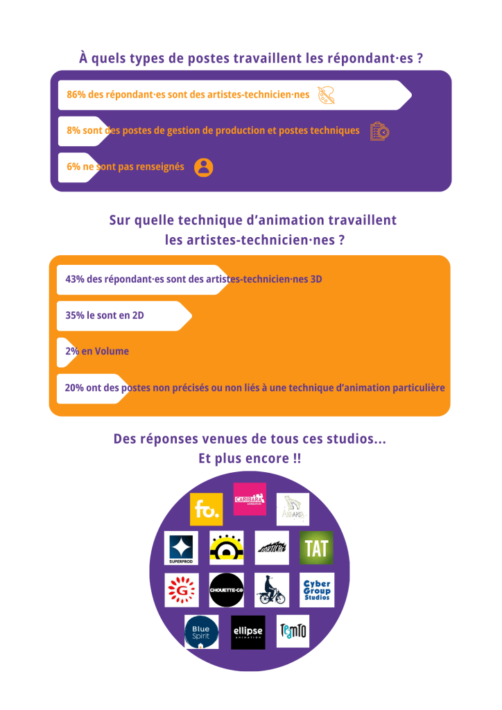 Nous l’avons basé sur deux modèles : un questionnaire mené en 2023 par Animation Workers Ireland, le syndicat principal de l’animation en Irlande, sur les conditions de travail et salaires du secteur; et le baromètre 2022 du STJV (Syndicat des Travailleureuses du Jeu Vidéo). Nous avons récolté, en un mois, plus d’un millier de réponses de personnes évoluant dans le film d’animation français, soit plus de 10% de l’ensemble du secteur, chiffre à partir duquel on considère en général les études statistiques comme représentatives. Il faut cependant noter que plusieurs questions demandaient une certaine subjectivité de la part des répondant·es, notamment sur leur estimation d’ancienneté et les questions liées aux abus et manquements du secteur.