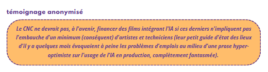 Beaucoup s’inquiètent de la montée des IA génératives récentes dans le secteur. Les syndicats, patronaux comme de travailleureuses, s’emparent progressivement du sujet, mais celui-ci évolue si vite qu’il est difficile à suivre pour légiférer sur son utilisation. Côté studio, il n’y a eu que La Cabane qui s’est ouvertement positionnée contre durant le festival d’Annecy 2024. Au sein du questionnaire, 81% des répondant·es s’inquiètent des protections contre les IAG, et 18% des témoignages portent sur le sujet. Mais le CNC, tout comme les festivals (Rennes et Annecy en tête) n’ont pas un positionnement fermé aux IAG, voire pas de positionnement public du tout vis-à-vis de cette technologie. Il y a un flou quant à l’utilisation des IAG déjà faite dans notre secteur, renforcé par l’afflux de posts pro IA tournant sur des plateformes comme Linkedin, et qui donne une impression d’omniprésence. Des exemples d’utilisation, tant à l’écriture qu’en concept art et character design, ont malgré tout déjà été rapportés, notamment lors du Contre Sommet de l’IA auquel nous avions participé, par la Guilde et le Syndicat des Scénaristes, ainsi que lors d’une table-ronde de l’AGRAF sur le sujet.