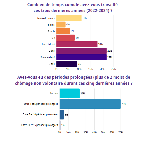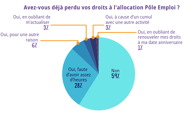 28% des répondant·es ont ainsi déjà perdu leur allocation d’intermittence faute de parvenir à faire leurs heures, mais un plus petit pourcentage est également responsable de sa perte de droits (13%), démontrant un besoin de responsabilisation et de formation des employé·es sur le sujet.