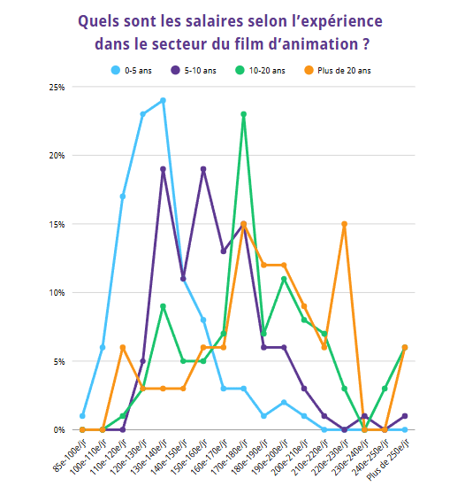 Il est probable que les studios, de par leur type de projets (séries, courts, longs), leur taille (TPE, PME) et leur technique d’animation (2D, 3D, stop motion, mixte), mais aussi, comme on l’a vu, de par leur localisation (avec une opposition Paris / région), proposent des salaires très différents, depuis le minima garanti jusqu’à une paye plus confortable. Les réponses au questionnaire font en tout cas montre d’une grande disparité de montant de salaire dans le secteur, et de la nécessité de s’organiser collectivement pour s’assurer que ceux-ci ne soient pas trop bas.
