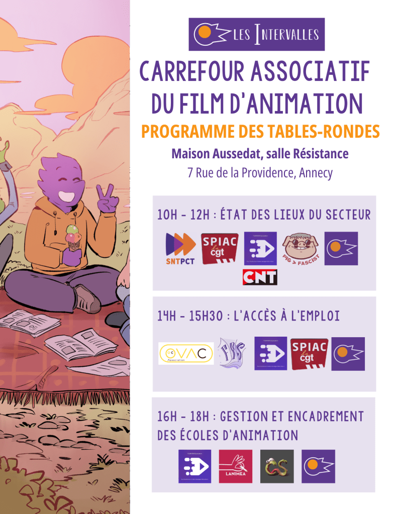 Pour la deuxième année consécutive, Les Intervalles organisent un carrefour associatif en parallèle du festival d’Annecy, avec une après-midi forum pour rencontre collectifs, associatifs et syndicats de travailleurs du film d’animation, et une journée de tables-rondes ouvertes à toustes.