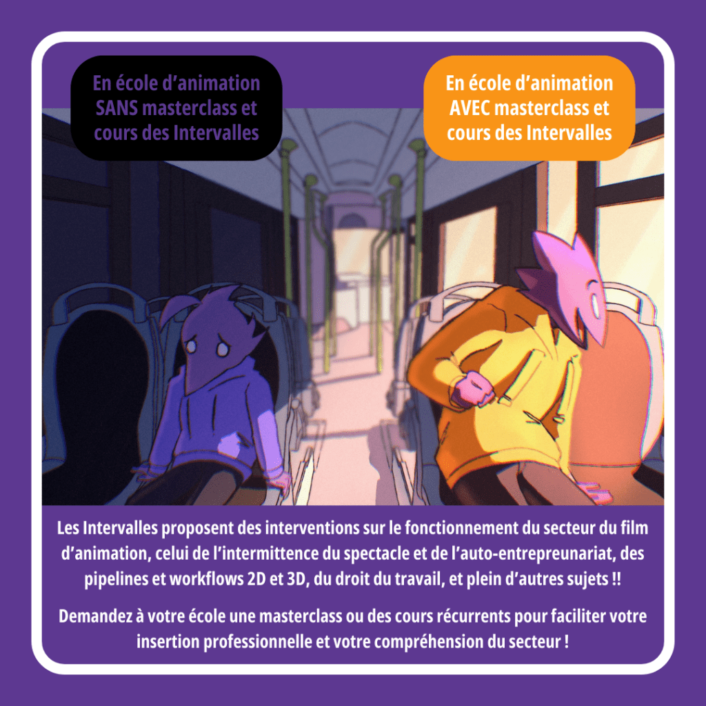Les Intervalles proposent des interventions sur le fonctionnement du secteur du film d’animation, celui de l’intermittence du spectacle et de l’auto-entrepreunariat, des pipelines et workflows 2D et 3D, du droit du travail, et plein d’autres sujets !!