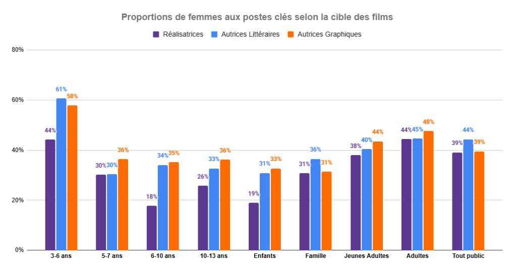 Le public adolescent reste le grand absent des audiences visées par le film d’animation : quel que soit son format, il n’est jamais pris en compte, à moins que la catégorie “jeune adulte”, mal définie, ne les intègre en son sein. On se retrouve encore, pour le cinéma, à produire majoritairement pour la famille (autrement dit, pour les enfants à partir de 6-8 ans), pour un public adulte dans le court-métrage, et pour les 6-10 ans pour les séries, cible élargie qui n’existait pas avant les années 2020.
