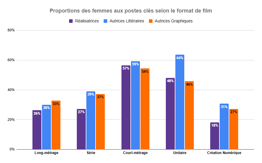 Concernant les auteurices littéraires et graphiques, s’iels peuvent changer ou voir leur équipe complétée en cours de production, leur apport aux projets dès leur développement est primordial et va grandement impacter les représentations qui y sont faites. Avoir moins de 40% de femmes pour ces deux postes clés en série et en long laisse craindre des biais de représentation genrés dans les productions, et des récits moins originaux, voire, pour certains, moins légitimes.