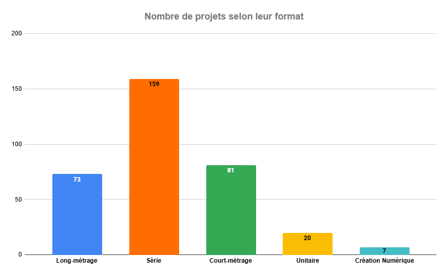 Les séries restent, comme toujours, le type de projet le plus produit en France : plus aisé à vendre à l’international, aux chaînes TV et aux plateformes de streaming, c’est la production “de masse” de l’industrie du film d’animation française. On verra pourtant qu’il n’y en a pas encore pour tous les goûts et tous les âges. Le court-métrage reste vaillant, mais a beaucoup perdu, arrivant presque au même niveau que le long-métrage, moins impacté par la crise. Les unitaires et créations numériques restent des formats très secondaires, en quantité, les diffuseurs n’ayant pas nécessairement de créneaux dédiés pour ces derniers.