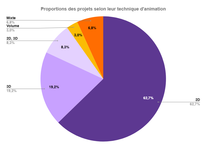 La 2D reste la dominante pour l’ensemble du secteur, quel que soit le format, sauf pour la création numérique où elle est absente à moins d’être mixée avec la 3D. À l’inverse, la 3D se retrouve très peu dans le court-métrage, et suffisamment peu dans l’unitaire pour laisser une place notable au volume, à hauteur de 10% des projets.