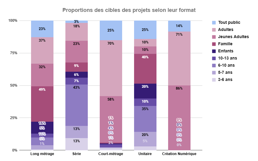Depuis le début des années 2020, les catégories de cibles ont évolué au-delà des classiques audiences que sont le preschool (3-4 ans), upper preschool (4-6 ans), bridge (6-8 ans), kids (8-10 ans) et tweens (10-12 ans). On retrouve de plus en plus de catégories d’âges mixtes, parfois très larges, allant dans ce Hors-Série jusqu’à du 5-13 ans pour certains projets. La catégorie “enfants” s’est quelque peu développée, sans que l’on sache bien à quel public elle correspond. Le “tout public” existait auparavant, mais correspondait plutôt à un niveau d’accessibilité d’une œuvre, signifiant qu’elle n’était déconseillée ou interdite à aucune tranche d’âge. De fait, nous n’avons pris en compte ici que les principales catégories d’âge, certaines n’apparaissant que très sporadiquement dans les projets listés. Ces derniers ont souvent plusieurs cibles renseignées, ce qui explique que le total, pour chaque format, fasse plus de 100%.