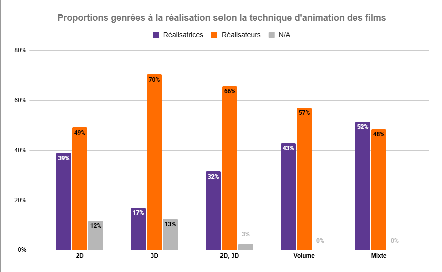 Là où le bas blesse, c’est sur les techniques : la 3D, sur l’ensemble des formats, est encore peu accessible aux réalisatrices, qui sont à l’inverse beaucoup plus présentes sur les techniques en volume et mixte (au-delà de la 2D-3D, incluant par exemple des images d’archives, de la prise de vues réelles, ou un mélange 2D, 3D et volume).